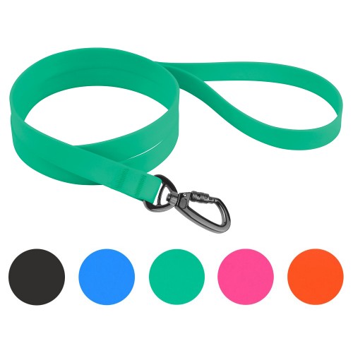 Погляньте на нашу нову серію водонепроникних повідців для собак у яскравих кольорах! Водонепроникні повідці для собак зроблені з нейлонової стрічки, покритої ПВХ (полівінілхлоридом). Цей матеріал має попит завдяки його довговічності і приголомшливим водовідштовхувальним властивостям. Ще одна перевага ПВХ полягає в тому, що він зовсім не вбирає води, бруду чи запахів. Водовідштовхуючий повідець комфортний в експлуатації і для вихованця, і для господаря. Також його дуже легко мити, так як можна робити це просто під проточною водою. Більше того, водонепроникний повідець не розтягується, коли собака смикає або тягне повідець. Спробуйте та відчуйте наскільки повідець з ПВХ покриттям гарний та легкий. Цей водонепроникний повідець доступний у чорному та яскравому синьому, зеленому, оранжевому та рожевому кольорах. Водовідштовхувальні повідці для собак оснащені сталевим карабіном з чорним карбоновим покриттям, дуже міцним і не піддається іржавінню. Його довжина 3 метри дозволяє зробити дистанцію між вами та собакою комфортною для щоденних прогулянок.